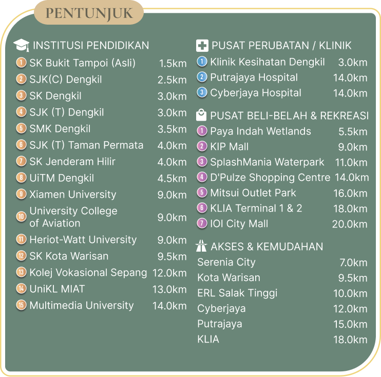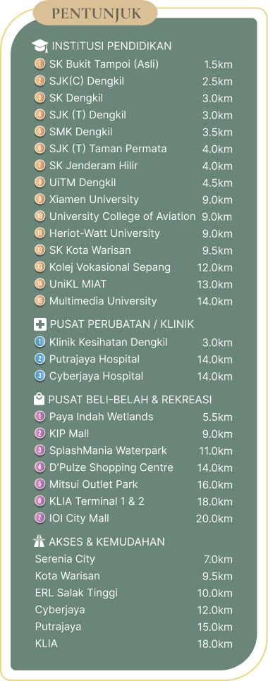 Penafian: Walaupun segala usaha munasabah telah diambil dalam penyediaan bahan ini, pihak Pemaju tidak akan bertanggungjawab terhadap sebarang ketidaktepatan yang terkandung di dalamnya. Walaupun semua pernyataan dipercayai tepat, ia tidak boleh dianggap sebagai representasi sebenar. Semua visual, imej digital dan ilustrasi yang dipaparkan adalah gambaran artistik dan tidak boleh ditafsirkan sebagai representasi sebenar. Selain itu, semua pelan, susun atur dalaman, maklumat dan spesifikasi adalah tertakluk kepada perubahan dan tidak boleh dianggap sebagai sebahagian daripada sebarang tawaran atau kontrak. Pihak Pemaju berhak untuk mengubah suai mana-mana bahagian bangunan, projek perumahan atau pembangunan, atau sebarang elemen sebagaimana yang diarahkan atau diluluskan oleh pihak berkuasa bangunan yang berkaitan sebelum penyiapan. Tambahan pula, semua pelan adalah tertakluk kepada pindaan sebagaimana yang diperlukan oleh Arkitek, Jurutera atau Pihak Berkuasa Bangunan yang berkaitan. Untuk maklumat khusus mengenai unit sebenar, sila rujuk kepada Perjanjian Jual Beli muktamad yang telah diluluskan oleh pihak berkuasa, dan unit akan dibina selaras dengannya.