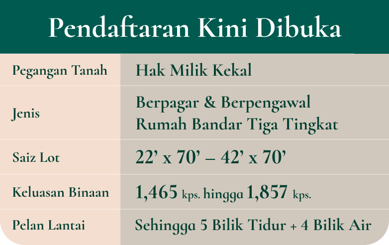 Miliki kediaman pegangan bebas dalam sebuah komuniti berpagar dan berpengawal yang mengutamakan keselamatan serta ketenangan hidup, direka khusus untuk keluarga yang sedang melangkah ke fasa kehidupan seterusnya.